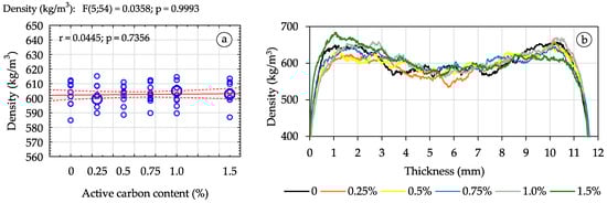Density is one of the most important parameters of particleboard. It can noticeably affect the vast majority of a board’s properties and can be used to control its targeted functional properties [54]. As shown in Figure 4a, the addition of activated carbon had no significant effect on the obtained density value (p > 0.05). The average result for each variant was very close to the assumption, and the difference did not exceed 5 kg/m3. Moreover, the most common U-shaped course of the density profile was observed for manufactured particleboards (Figure 4b). This phenomenon is highly beneficial because denser subsurface layers contribute to a more efficient transfer of both tensile and compressive stresses during bending [55]. However, the implemented adhesive modification did not affect the density profile.