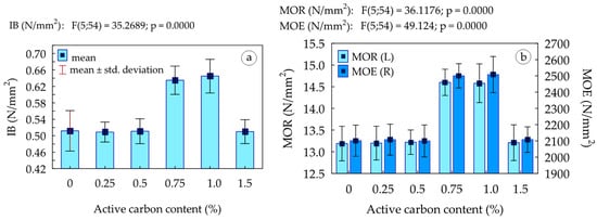 In summary, the aim of the presented research was to investigate the effects of urea–formaldehyde adhesive modification with small amounts of activated carbon from coconut shells, ranging from 0.25 to 1.5%, on the properties of manufactured interior-grade particleboard.