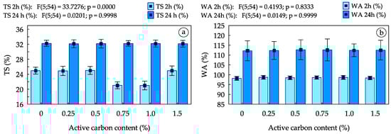 The results of TS and WA, indicating the overall water resistance of the manufactured particleboard, are presented in Figure 6. It was found that the applied modification with ACCS affected only the TS results determined after 2 h of soaking (p < 0.05). In the case of variants containing 0.75 and 1%, the recorded value of TS was reduced by approx. 16% compared to the reference particleboard. Considering that this phenomenon was observed only for variants characterized by the improved IB, which is a basic indicator of adhesive performance in the particleboard, the reason for the improved water resistance was most likely the reinforcement of the adhesive bonds [59,60,61]. However, it seems that 24 h was enough time for a hydrolytic degradation of the UF adhesive bonds to progress, which led to the average TS values at the reference board level [62,63]. Nevertheless, the increase in swelling and water absorption observed for the variant containing 1.5% ACCS in the previous study was not observed [29]. This proves again that further research aimed at investigating the effects of factors such as the activated carbon preparation method, activated carbon characteristics, dimensional fraction, homogenization conditions, pressing conditions, and initial properties of adhesive on the expected outcome is still needed. However, it can be concluded that, in this case, the addition of ACCS delayed the degradation of UF adhesive bonds, which was shown by short-term improvement, but had no effect under long-term exposure to water.