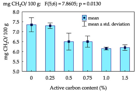 The results of the formaldehyde content analyses are shown in Figure 7. Statistical analysis showed that the modification had a significant effect on the formaldehyde content (p < 0.05), but the effect varied depending on the amount of added modifier. It was found that a significant reduction was observed only for variants containing 1 and 1.5% of ACCS. Compared to the reference board, the recorded formaldehyde content was lower by approx. 16%. This effect was caused by the ability of activated carbon to adsorb formaldehyde, attributed to its high porosity and specific surface area [46]. A detailed description of the mechanism of formaldehyde adsorption by activated carbon can be found in the recent paper by Kang et al. [18]. This effect is consistent with the results of research on MDF boards performed by Darmawan et al. [64] and Zamani et al. [30], who also observed the reduction in formaldehyde release. This is beneficial due to the harmful nature of the formaldehyde emitted and the regulations of emissions that follow the growing awareness of health risks that may occur from long-term exposure [65].
