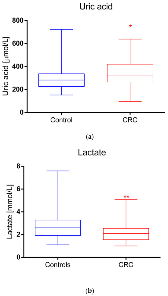 In this regard, studies are focused on the interplay between circulating obesity-related biomarkers and colon pathologies. Reliable biomarkers would provide treatment at different stages of the disease to determine disease progression and recurrence, as well as provide a personalized therapeutic approach [7]. A number of biomarkers have been studied in CRC with the aim of providing early diagnosis, treatment, and prognosis. Biochemical parameters related to impaired metabolism have been extensively studied in cancer patients. The significance of plasma uric acid (UA) and lactate in health and disease has been revisited recently after their recognition as signaling molecules [8,9,10,11].