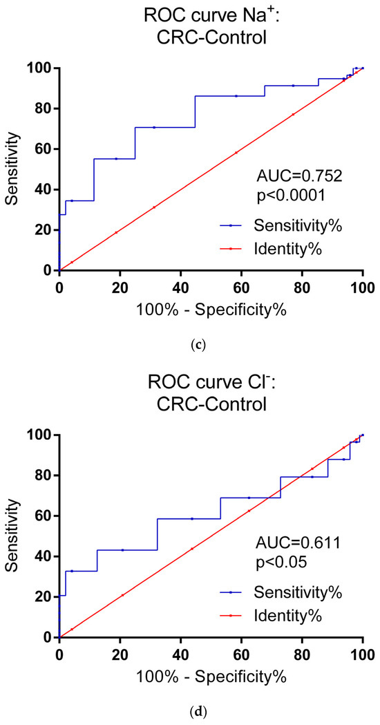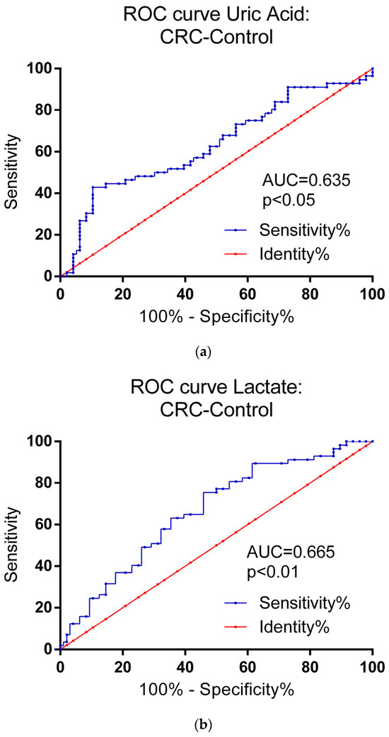 An ROC curve analysis for diagnostic potential revealed that lactate, UA, osmolality, Na+, and Cl− plasma concentrations are parameters that can distinguish between the CRC and Control groups. Na+ and osmolality showed satisfactory diagnostic potential, and plasma lactate, UA, and Cl− showed low diagnostic potential (Figure 2).