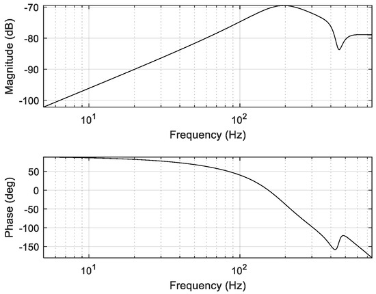 Here, kp and ki refer to proportional gain and integral gain, respectively, and the control gain should be chosen based on a balance of stability and performance. In this paper, the tunable parameters (kp and ki) of the PI controller are manually designed in the experiment and set to be kp = 0.75 and ki = 950. Figure 3 depicts the open-loop transfer function of the PI controller designed for the FSM control system in this study. The margins of gain and phase are 6.03 dB and 47.1°, respectively. Also, the crossover frequency and loop gain are 111 Hz and over 40 dB, respectively. Moreover, the disturbance-attenuation performance of the designed PI controller for the FSM control system is illustrated in Figure 4.