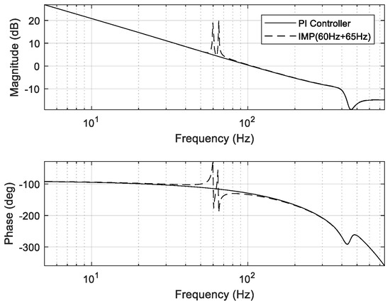 Open–loop transfer function of IMP-based controller (at 60 and 65 Hz).