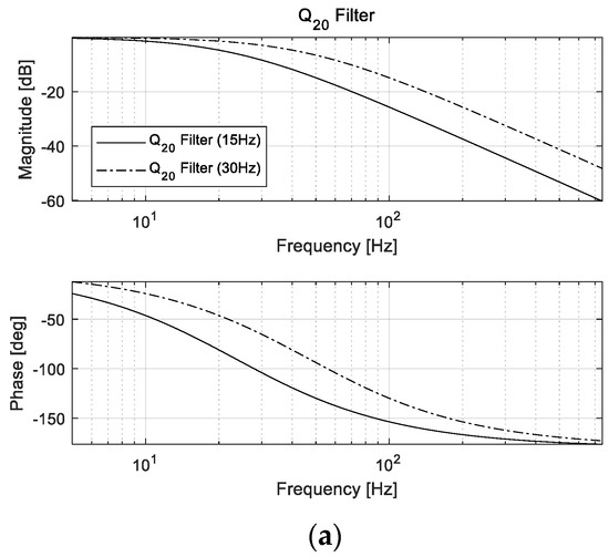 In this study, the stability of the control system is related to the tunable coefficient and the order of the Q filter. Therefore, the tunable coefficient and order of the Q filter should be designed to improve the stability of the control system through the measurement data of the disturbance attenuation. Here, the Q20 and Q30 filters were utilized for the DOB-based controller for the FSM system, as illustrated in Figure 11. Via the analysis of the residual control-error signal (CES), which is the experimental result, the stability of the control system can be estimated. Consequently, utilizing Q20 and Q30 filters effectively improved the disturbance-suppression performances of the FSM control system. Moreover, the disturbance-suppression performances of the FSM motion system were effective in the low-frequency region with bandwidths of 15 and 30 Hz. The open-loop transfer functions of the aforementioned Q20 and Q30 filters with bandwidths of 15 and 30 Hz are expressed as follows: