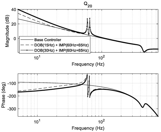 Open–loop transfer function of IMP-based controller (at 60 and 65 Hz) with DOB (Q20 filter).