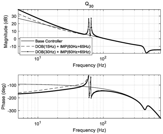 Open–loop transfer function of IMP-based controller (at 60 and 65 Hz) with DOB (Q30 filter).