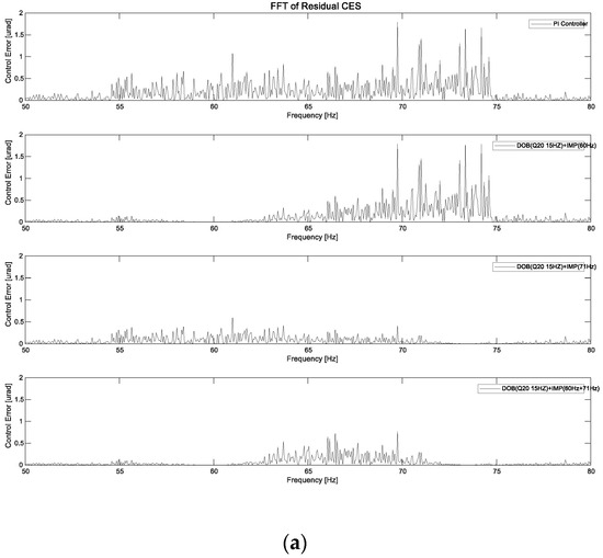 When the IMP-based controller with DOB (Q20 filter 15 Hz) was used at 60, 65, and 71 Hz, the CES values decreased by approximately 12.67, 15.3, and 28.1%, respectively, compared to those when using the IMP-based controller alone. When the IMP-based controller with DOB (Q20 filter 30 Hz) was used at 60, 65, and 71 Hz, the CES values decreased by approximately 15.1, 17.5, and 30.9%, respectively, compared to those when using the IMP-based controller alone. When the IMP-based controller with DOB (Q30 filter 15 Hz) was used at 60, 65, and 71 Hz, the CES values decreased by approximately 18.5, 21.1, and 32.8%, respectively, compared to those when using the IMP-based controller alone. When the IMP-based controller with DOB (Q30 filter 30 Hz) was used at 60, 65, and 71 Hz, the CES values decreased by approximately 22.4, 24.1, and 34.2%, respectively, compared to those when using the IMP-based controller alone.