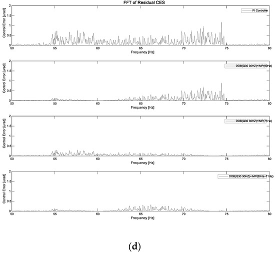 In this study, we compared two main cases. First, in the IMP-based controller, the Q20 filter was used as the DOB. Second, in the IMP-based controller, the Q30 filter was used as the DOB. Moreover, the bandwidths of each of the binomial Q20 and Q30 filters were set to 15 Hz and 30 Hz. The target rotational position was successfully maintained at 500 μrad. As illustrated in Figure 15, the power spectrum of the residual CES of the IMP-based PI controller was 7.97 μrad. In the first case, when we used the IMP-based controller with the DOB (Q20 filter 15 Hz) at 60, 65, and 71 Hz in the FSM control system, the CES values were 6.96, 6.75, and 5.73 μrad, respectively, as illustrated in Figure 16a. When we used the IMP-based controller with the DOB (Q20 filter 30 Hz) at 60, 65, and 71 Hz in the FSM control system, the CES values were 6.76, 6.57, and 5.51 μrad, respectively, as illustrated in Figure 16b. In the second case, when we used the IMP-based controller with the DOB (Q30 filter 15 Hz) at 60 Hz, 65 Hz, and 71 Hz in the FSM control system, the CES values were 6.49, 6.28, and 5.36 μrad, respectively, as depicted in Figure 16c. When we used the IMP-based controller with the DOB (Q30 filter 30 Hz) at 60, 65, and 71 Hz in the FSM control system, the CES values were 6.18, 6.05, and 5.24 μrad, respectively, as depicted in Figure 16d.