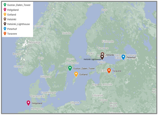 In order to search for the multiannual trends and extreme aerosol optical depth (AOD) cases, we selected seven AERONET stations, which are located around the Baltic Sea and provide long-term data, and chose level 2.0 and λ = 500 nm (AOD_500/550). The AOD is a measure of the extinction effect of atmospheric aerosols and is typically used as a parameter to assess the degree of air pollution. The AOD data were not always collected and available at the same periods; however, the selected stations provide good geographical and multiannual coverage of the region. The following AERONET stations were selected for the AOD analyses (Figure 2).