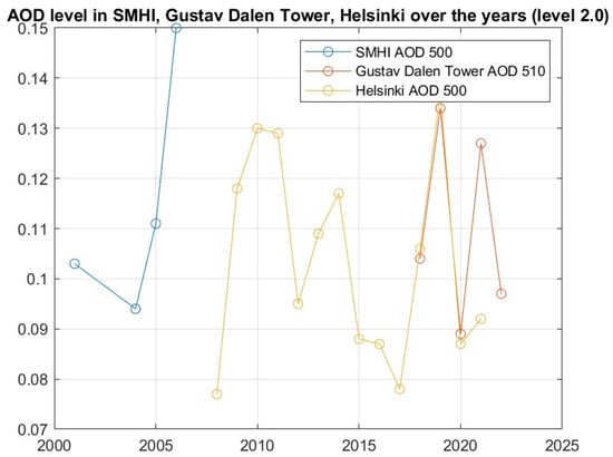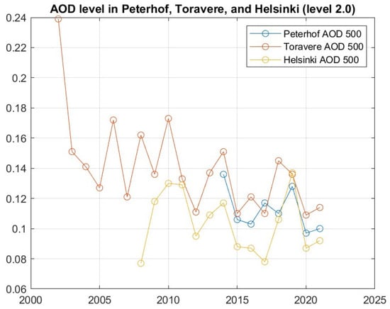 The next step was to analyze the AOD data from the stations with more recent data, until 2022. These analyses refer to the stations in Peterhof, Toravere, and Helsinki (Figure 6).