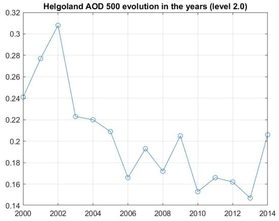 Subsequently, the Helgoland station AODs were investigated (Figure 4). These analyses provide insight into the southwest region of the Baltic. As shown in Figure 4, it is evident that between 2000 and 2014, there is a clear decrease in the AOD_500 values in Helgoland.