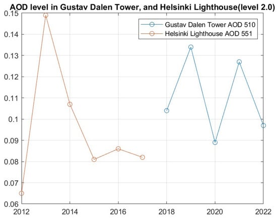 Two stations, Gustav Dalen Tower and Helsinki Lighthouse, were also analyzed at wavelengths λ = 510 and 551 nm for the period between 2012 and 2022 (Figure 5). An AOD decline is noticeable for both stations; however, it is noteworthy that for both stations, there are values in 2013 and 2014 that do not follow this trend, as they are both slightly higher.