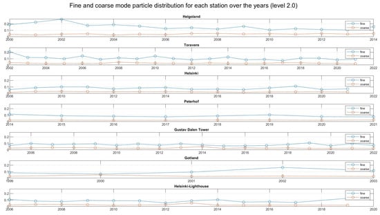 For the Gotland station, between 1999 and 2003, we observed a clear increase in fine mode particle domination, which is consistent with the similarly observed increase in the aerosol number concentration during the same period. In the case of the three stations situated in Finland and Sweden (Helsinki, Gustav Dalen Tower, and Helsinki Lighthouse), it is evident that both the fine and coarse aerosol particle trends show a slight downward trajectory. The decline is very subtle, to the extent that one could even consider their evolution as relatively constant over time. However, there is a clear domination of fine particles over coarse aerosol particles. Again, 2019 shows a “jump” in fine and coarse mode values.