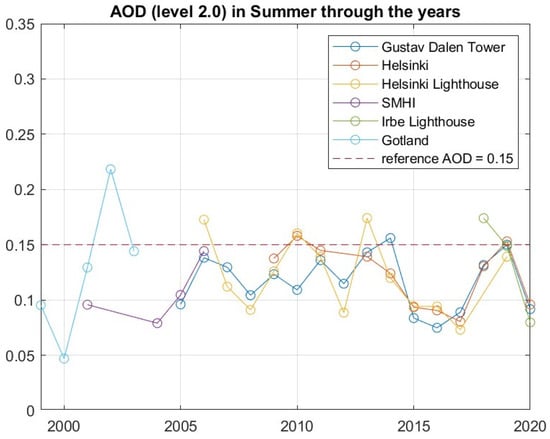 Moreover, compared to the other summer trend AOD level (Figure 8), the 2019 summer is higher: it was always around 0.15 for each station (Helsinki Lighthouse, Irbe Lighthouse, Gustav Dalen Tower, and Helsinki). In fact, most of the time, the AOD level was under 0.15 for the other years (2007 to 2009, 2015 to 2018 and 2020) or was not the same at each station, which did not allow us to make conclusions (2006, 2010, 2013, 2014). In some cases, due to the small number of data, for example, from 1999 to 2005, we have only two values of the maximum AOD level; therefore, we cannot make any conclusions. However, another study was conducted for the year 2002 (see [] for the entire study and results). In this study, the high AOD level (0.7 for August 2002) during 2002 was related to a very warm and long period (of seven months from February to September 2002) increasing the number of wildfires.