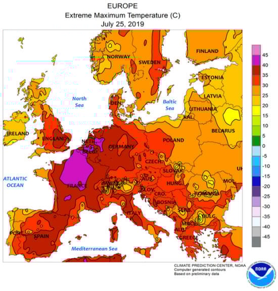 On 21 July 2019, the wind came from France, Germany, and Russia, with a high level of particles in both of these areas resulting in a high level of PM10, PM2.5, and PM1 for this day, between 60 and 100 μg·m−3. Moreover, according to Figure 10, around 25 July 2019 was a period of a heatwave with temperatures higher than 40 °C in France and 35 °C in Germany, making wildfires easier to spread, corroborating the 193% of the average 2019 wildfires in Germany (Table 3).