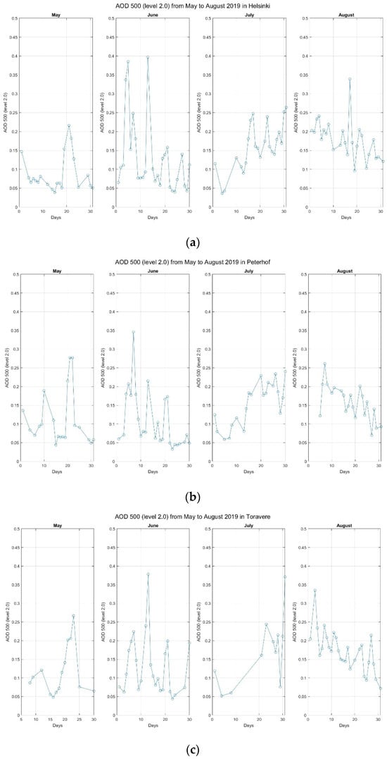 We chose specific dates (22 May 2019, 25 May 2019, 13 June 2019, 21 July 2019, and 23 August 2019) for which we have a high value of AOD in Figure 11d in the area of the three stations: Helsinki, Peterhof, and Toravere. For 22 May 2019 and 25 May 2019, the AOD is between 0.21 and 0.27 at each station; for 13 June 2019, it is around 0.4 for all the stations; and for 21 July 2019 and 23 August 2019, it is around 0.2.