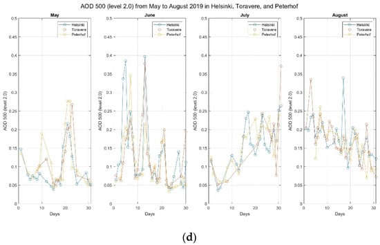 AODs at 500 nm (level 2.0) from the Helsinki, Peterhof, and Toravere between May and August 2019. (a) AODs at 500 nm (level 2.0) from the Helsinki station between May and August 2019. (b) AODs at 500 nm (level 2.0) from the Peterhof station between May and August 2019. (c) AODs at 500 nm (level 2.0) from the Toravere station between May and August 2019. (d) AODs at 500 nm (level 2.0) from each station between May and August 2019.