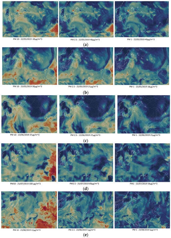Transport of particles (PM1, PM2.5, and PM10) with wind circulation []. (a)—22/05/2019 for PM10, PM2.5, and PM1. (b)—25/05/2019 for PM10, PM2.5, and PM1. (c)—13/06/2019 for PM10, PM2.5, and PM1. (d)—21/07/2019 for PM10, PM2.5, and PM1. (e)—23/08/2019 for PM10, PM2.5, and PM1.