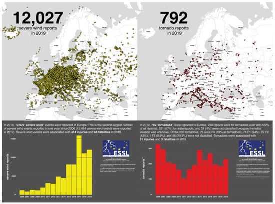 Moreover, 2019 was a year with many severe wind events in all of Europe: more than 12,000 were recorded, and there were several tornadoes in the same area (792) []. Figure 13 presents an overview of these events across Europe.