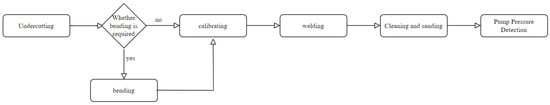 Shipbuilding is a process with a long cycle and tedious tasks, and this process requires the cooperative production of various workshops and departments. Among them, the shipyard pipeline-processing workshop is an important workshop in the shipbuilding process, and its task is to process various kinds of marine pipes with different specifications. The process of shipyard pipeline processing usually includes six main processes, i.e., undercutting, bending, pipe calibration, welding, cleaning and grinding, and pump-pressure testing. According to the specific application requirements of the pipeline, some pipelines need to bend, while others do not. Figure 1 shows the typical process of shipyard pipeline processing.
