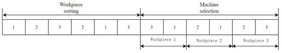 A good encoding and decoding design not only affects the effective extraction and expression of information but also determines the algorithm’s ability to recover information and the final application effect. fFJSP needs to determine the processing order of all workpieces and allocate processing machines for each operation. Therefore, this article uses the OSMS method to code the problem. Each black widow spider consists of two parts, i.e., operations sequencing (OS) and machine selection (MS). For the part of workpiece process arrangement, the workpiece number is directly encoded. The order in which the workpiece number appears represents the processing sequence between the workpiece processes, which is interpreted in order from left to right. total number of processes, representing the length of the workpiece sorting coding part, which is half of the total coding length. The process number represents a specific process number for each workpiece. For the -th occurrence of workpiece number , it represents the -th process of the workpiece , and the total number of occurrences of the workpiece number is equal to the total number of processes of the workpiece. For the machine-allocation part, each element represents the selected machine corresponding to each process, so the length of the machine selection part code is also . Figure 3 illustrates the method.