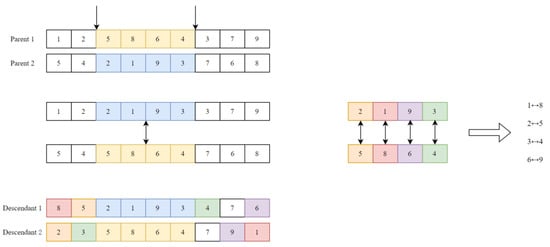 Partial mapping crossover is a relatively simple and effective crossover operation, which can introduce new mutation combinations for the next generation of individuals by exchanging some gene information in the parent individual. This can increase the search space of the algorithm and help it better explore the solution space of the problem. The process is shown in Figure 5.