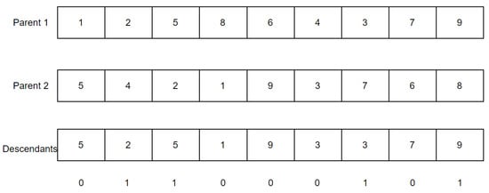 In machine selection, priority-preserving crossover (GPPX) is used, with two feasible parents. The solution generated by this crossover operator is still feasible. First, for each individual in the population, another individual is randomly selected as the parent, and then a binary string consisting of 0 and 1 is uniformly generated, with the same length as the machine assignment vector. During the crossover process, each element of the binary string is checked. If it is 0, the corresponding gene of the second parent will be selected; if it is 1, the corresponding gene of the first parent will be selected. This design preserves the sequence of genes, ensuring that the chromosome structure of individuals after crossing is similar to that of one of their parents. Finally, the new individuals generated by the crossover operation are added to a new population, which can be used in subsequent algorithm iterations to generate better solutions. This approach helps preserve the beneficial characteristics of the parent individuals and promotes the transmission of excellent genes, thereby improving the adaptability of the entire population. The process is shown in Figure 6.