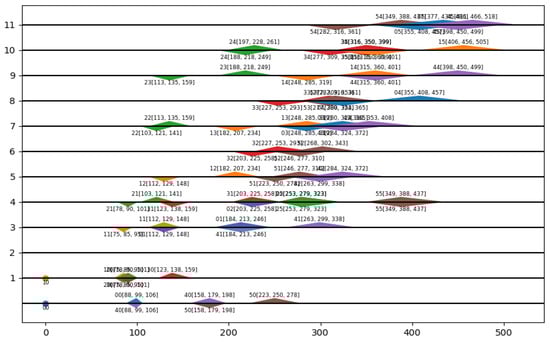 Decoding the optimal feasible solution (411, 466, 518) obtained from BWOA in the table, we present the fuzzy Gantt chart of the scheduling scheme in Figure 8.
