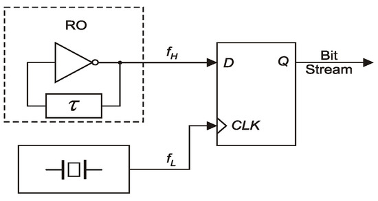 In an RO-based TRNG, the signal from RO is sampled in a flip-flop, using another signal with a lower frequency (Figure 1). Delay τ is usually implemented as a chain of even-number inverters, a chain of latches, or even a delay line [17].