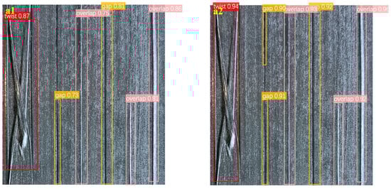 Overall, Improved YOLOv7 demonstrates superior detection performance across all defect types, with significantly higher average AP values compared to other algorithms. In particular, in wrinkle and twist defect detection, Improved YOLOv7 outperforms other algorithms, which can be attributed to its comprehensive integration of various improvement strategies. Firstly, the introduction of the BiFormer attention mechanism enables the model to better regress the size and position of targets by capturing subtle defect features, thereby enhancing the detection accuracy and recall. Secondly, the AFPN feature fusion strategy balances detailed information and semantic information, avoids significant semantic differences between different hierarchies, and strengthens feature fusion. Additionally, the WIoU loss function is more sensitive to small targets, aiding in optimizing the accuracy of bounding box regression. Improved YOLOv7 outperforms other algorithms in AFP defect detection in composite materials. This algorithm demonstrates higher accuracy and practicality in handling various defects due to the enhancement of detail sensitivity, feature fusion optimization, and accuracy improvement in bounding box regression brought about by the integration of multiple improvement strategies.