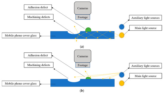 1]. During these operations, glass, as a transparent and smooth product, can be easily subjected to damage caused by mechanical or human operational errors. With defects such as pitting, scratches, chipping, and watermarks, the damaged glass fails to move on to subsequent processing operations. In addition, transferring the production line of mobile phone flat glass following processing operations will un-avoidably result in dust in the air adhering to the surface of the mobile phone flat glass, thus degrading its quality. Currently, manual visual inspection work is a common method for detecting the defects in mobile phone flat glass. However, its relatively high subjectivity and uncertainty lead to low detection precision, a high false acceptance rate, and a high false rejection rate. With current conventional light sources, it is difficult to distinguish dust, a repairable defect, from other irreparable defects. For instance, the similar imaging characteristics of dust and point defects make it easy to make misjudgments, resulting in serious resource waste and quality problems. To solve the problems brought about by manual inspection, it has become urgent to realize the automatic defect inspection of mobile phone flat glass.