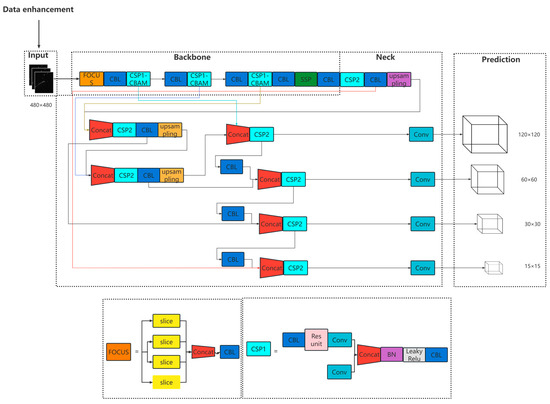 In the process of extracting image features with the help of a convolutional neural network, the local receptive field can perceive the ever-expanding original image as the convolution layers deepen and the resolution of the feature map decreases. Moreover, the closer the feature map is to the top level, the more attention it tends to pay to global information. As a result, the deep features extracted by the deep neural network are extremely unsuitable for small target detection. It should be admitted that shallow feature maps, with relatively small local receptive fields and more position and detail information, can partially compensate for the deficiency of deep features. However, if single shallow features are employed to detect targets, they will cause serious false positives and missed detections due to a lack of guidance from advanced semantic information. In YOLOv5, the feature maps of 60 × 60, 30 × 30, and 15 × 15, which are obtained from an input image with a size of 480 × 480 after 8, 16, and 32 downsampling operations, are the exact places where the network conducts target detection. Among these feature maps at three scales, the feature map downsampled 8 times has the smallest local receptive field. Therefore, it is difficult to learn the feature information of small targets with a resolution lower than 8 × 8. To solve this problem, a detection header with 4 downsampling operations is added to the original network model. A feature output is added after the first CSP1 module of the backbone network, which is connected to the neck to conduct feature fusion at the same scale. After the CSP1 module and convolution operations, it is input into the newly added small target detection layer for prediction. The improved network model is represented in