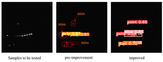 Figure 11. The improved model can correctly identify and detect small targets on the mobile phone’s flat glass, whereas the original model fails to detect some small targets. This proves the effect of such an improvement in enhancing the detection of small targets.