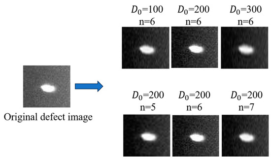 Figure 12b, the bright central position belongs to the low frequency region, which features gray-scale transformation and belongs to a flat region in the spatial domain. The darker side parts belong to the high frequency region, which represents the edge and noise in the spatial domain. In order to retain the edge information while suppressing the noise, a Butterworth low-pass filter was adopted, and its transfer function is as follows: