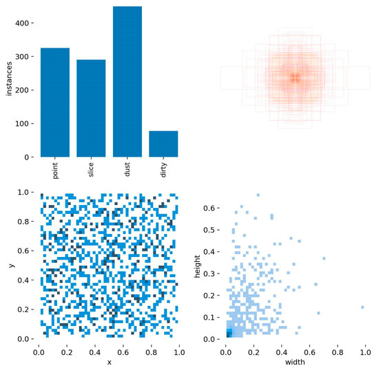In the end, the labeling and position information are output. Bright spot defects are marked as 0, scratch defects are marked as 1, stain defects are marked as 2, and dust defects are marked as 3. A normalization operation is conducted on the position information to improve the convergence speed and precision of the model and generate text data. The data distribution generated is shown in