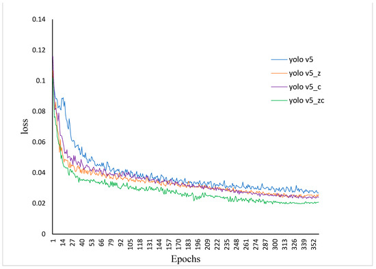 Figure 18, the loss functions of the YOLOv5c and YOLOv5z converge faster and to smaller values compared to the YOLOv5 as the number of epochs increases. This indicates that both improvement methods yield better training results than the original model. Furthermore, with the combination of both improvement methods in the YOLOv5zc, the loss function converges even faster and to smaller values compared to the YOLOv5c and YOLOv5c alone. This suggests that the combined approach of the two methods enhances the training effectiveness of the model.