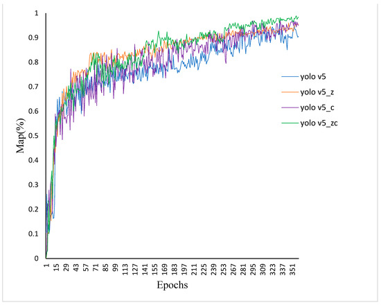Figure 19 illustrates the curve of the mean average precision (MAP), varying with the increase in epochs for all four models during training. By comparison, it is evident that the YOLOv5zc achieves the highest MAP value and the most stable curve as the number of iterations increases.
