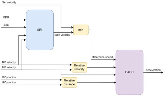 In the context of our control concept (see Figure 1), the CACC is responsible for calculating the acceleration required to achieve the reference speed. The reference speed can be set by the driver or in the event that the actual risk is deemed to be too high, updated by the system. The CACC function is based on a standard MPC controller, and it considers the relative velocity, the relative distance, and the HV velocity as input variables. The Safety Risk Index (SRI) block is responsible for resolving the optimization problem of minimizing the difference between the tolerable and actual risk by manipulating the value of the reference speed. Our proposed control could overwrite the reference speed set by the driver if the mentioned SRI is higher than the predefined target value.