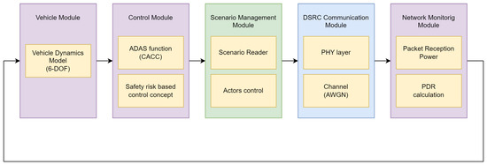 Our simulation environment could be separated into five modules as in Figure 2. The first one is the vehicle dynamic module, which is a six-dimensions-of-freedom (6-DOF) electric vehicle model that has one engine on the rear axle. This complex model was chosen to support a realistic vehicle simulation and reliable conclusions. The second module contains the vehicle control function, while the third module is responsible for the scenario initialization and actor control.
