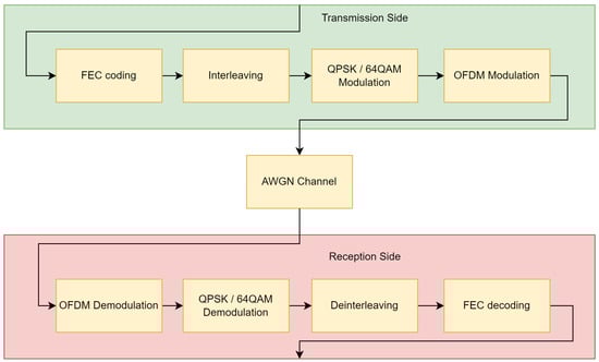 After FEC coding, interleaving is used to prevent the occurrence of long sequences of adjacent noisy bits. The required modulation is then applied to the bit stream before it is transmitted to the channel. The Orthogonal Frequency Division Multiplexing (OFDM) modulation is applied last, before transmission. To simulate the effect of ambient noise on the message, we introduced additive white Gaussian noise (AWGN) into the channel. As specified in the 802.11p standard [24], the standard parameters for OFDM modulation were used (see Table 2).