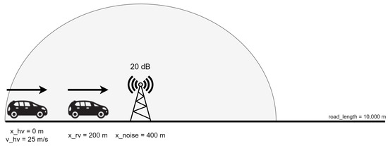In addition, as part of the investigation of the control mechanism to mitigate the effects of a degraded network performance, a simple noise generator was introduced at a distance of 400 m from the HV starting position. This additional interference generator has been included to make the scenario more complex for the V2X communication and to facilitate the testing of our proposed control concept in a noisy environment. As illustrated in Figure 4, the noise generator covers an area with a 400 m radius, with a 20 dB signal strength at the center point, which then gradually decreases as we move away from the source.