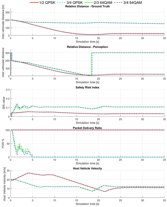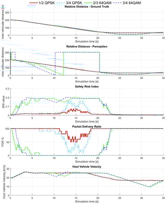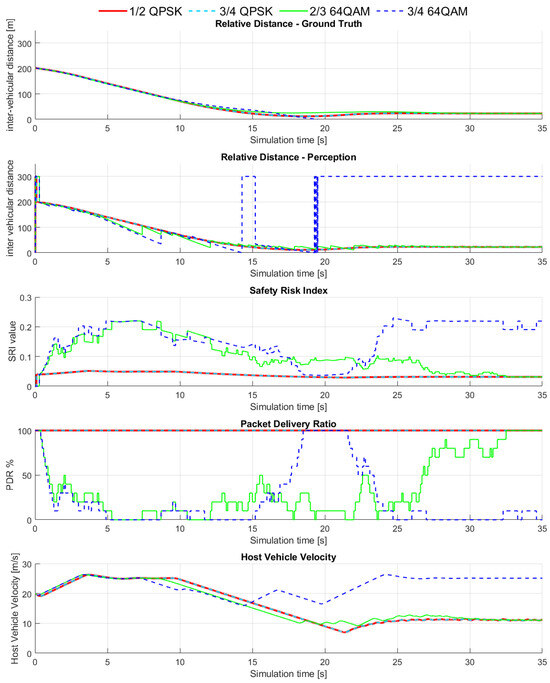 To test our concept more deeply, we increased the delta velocity between the vehicles to 50 kph. In Figure 7, the simple CACC was evaluated in multiple plots. From the relative distances and HV velocity plots, it can be seen that almost all of the modulations were able to adapt to the remote vehicle velocity and keep a safe distance between them. In the case of 64QAM modulations, the PDR dropped to very low values, and the 3/4 coding rate was unable to react in time. At approximately the 18th second of the simulation, a collision occurred between the two vehicles.