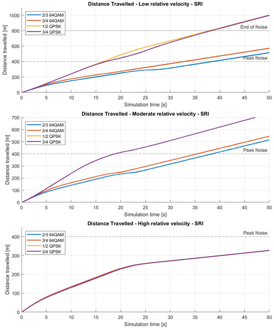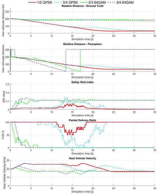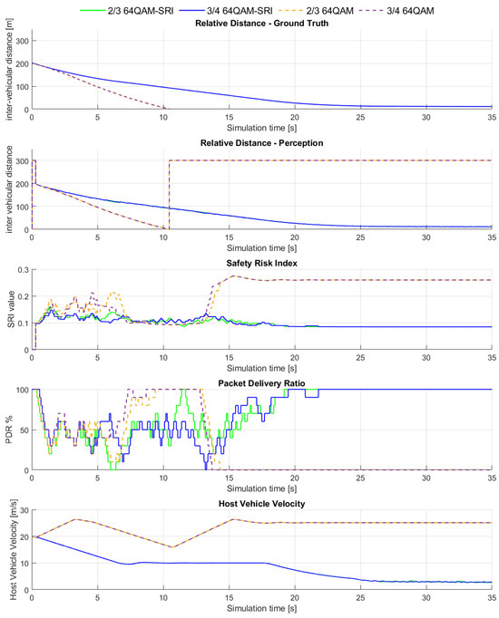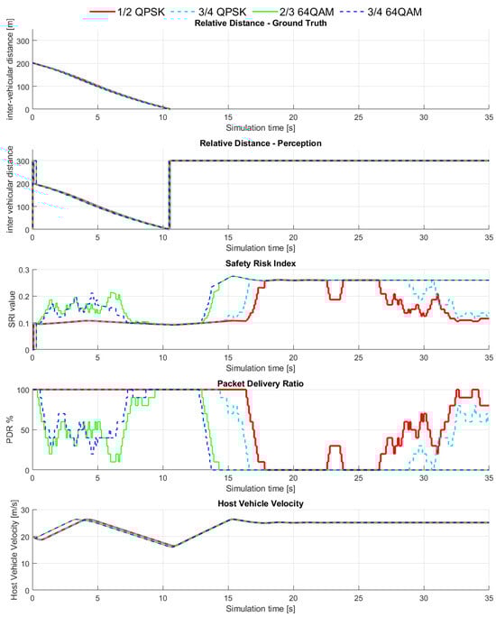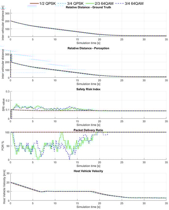 Finally, we investigated a scenario in which the remote vehicle slows down suddenly due to an unforeseen event on the road. Due to the high delta velocity, none of the modulation techniques were able to react in time to prevent the accident, as illustrated in Figure 9. SRI was high from the beginning of the simulation due to the high velocity differences and, in the case of the 64QAM modulation, the network degradation. Following the collision, which occurred approximately 11 s into the simulation, the presented plots are no longer valid. However, this illustrates that even the QPSK modulation was no longer within the reception distance.
