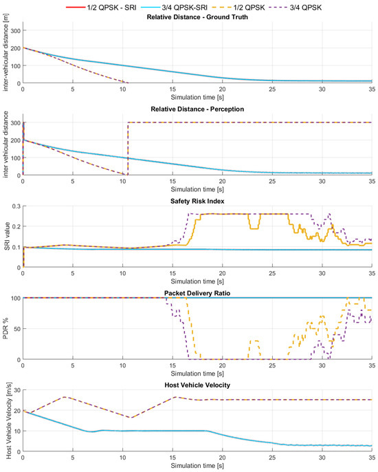 In Figure 11, the different QPSK modulations can be seen with and without the proposed model. The continuous lines show the SRI-based CACC results. Due to the high relative velocity, the safety risk was high from the beginning even when the communication was good. The dashed lines show the simple method where the control could not stop the host vehicle in time. Following the collision, which occurred approximately 11 s into the simulation, the presented plots are no longer valid.