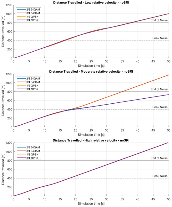 In Figure 13, similar curves can be observed when there was no additional control involved. In the case of high relative velocity, at around 10 s, all modulations crashed with the RV. Moreover, when there was a moderate relative velocity, only the higher coding rate version of the 64QAM modulation resulted in a crash, which explains the split of curves.