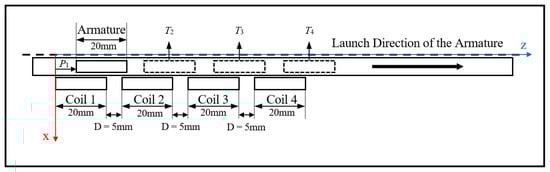 Studying the parameter characteristics of the induction coil launch device is the basis for conducting research on coil launch devices. For a multi-stage induction coil launch device, as the driving coil accelerates the armature stage by stage, the speed at which the armature enters the driving coil increases. To improve the launch efficiency of the device, selecting appropriate device parameters involves analyzing the characteristics of each parameter as the armature entry speed increases. The two-dimensional schematic diagram of the coil launching device in this study is shown in Figure 2. The armature is launched in the direction of the arrow in the diagram, with a distance D = 5 mm between each stage of driving coils. The armature is progressively accelerated by four stages of coils. represents the triggering position of the armature in the first-stage driving coil, while (where i = 2, 3, and 4) represents the triggering time of the armature in the second- to fourth-stage driving coils. The driving coils are powered at the appropriate triggering times to accelerate the armature forward. Not all structural and electrical parameters of multi-stage induction coil devices need to be optimized. In this study, the armature to be launched is predetermined, and the armature parameters cannot be adjusted as the armature entry speed changes because the same armature is accelerated by different stages. As for the parameters of the driving coil, its inner diameter can usually be directly determined based on the known outer diameter of the armature, and the aspect ratio of the driving coil should gradually transition from short and thick coils to long and thin coils as the number of device stages increases, with the number of turns gradually decreasing.