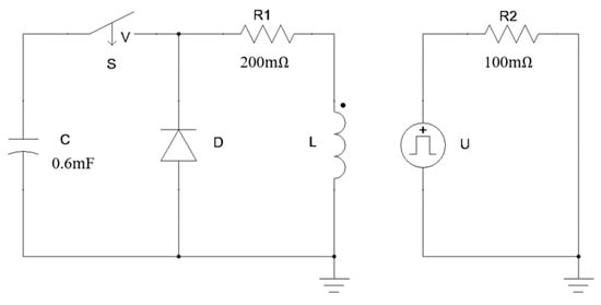 In addition, fully charged capacitors are used to discharge the four-stage drive coils, and there is a freewheeling branch in the driving circuit. The external power supply circuit and control circuit of the single-stage drive coil are shown in Figure 4. In this figure, C represents the energy storage capacitor, S represents the pressure-controlled switch, which is controlled by the control circuit to determine its closure status, D represents the diode in the freewheeling branch, and U represents the pulse voltage source. In this article, drive coils of the same specifications are used. In order to match the armature velocity, with the given input energy of 300 J for each stage coil, different power supply parameters are set for the drive coils of stages 1–2 and stages 3–4, as shown in Table 2.