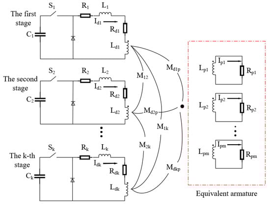 Assuming a synchronous induction coil launching device with n drive coils and m armature segments, when the k-th drive coil begins to conduct, the equivalent circuit model is as shown in Figure 5. The current through the drive coils is (i = 1, 2, …, k); the resistance of the drive coil loop is (i = 1, 2, …, k); the inductance of the drive coil loop is (i = 1, 2, …, k); the resistance of the loop coil is (i = 1, 2, …, k); the inductance of the loop coil is (i = 1, 2, …, k); the mutual inductance between the drive coils is (i,j = 1, 2, …, k); the mutual inductance between the drive coils and armature segments is (i = 1, 2, …, k, j = 1, 2, …, m); the mutual inductance between armature segments is (i,j = 1, 2, …, m); the resistance of the armature segment loop is (i = 1, 2, …, m); the self-inductance of the armature loop is (i = 1, 2, …, m); and the current through the armature segment loop is (i = 1, 2, …, m).