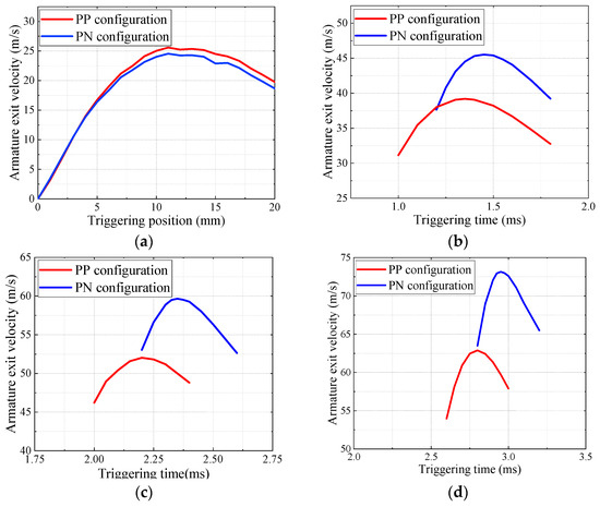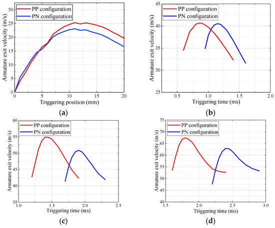 Finally, the armature is accelerated using the optimal triggering positions and times for the first three stages. The optimal triggering time for the fourth-stage coil is obtained by incrementally changing the triggering time and conducting successive experiments. Figure 6d and Figure 7d display the variation of armature velocity with the triggering time of the fourth-stage coil for the PP and PN configurations of the launching device, respectively.